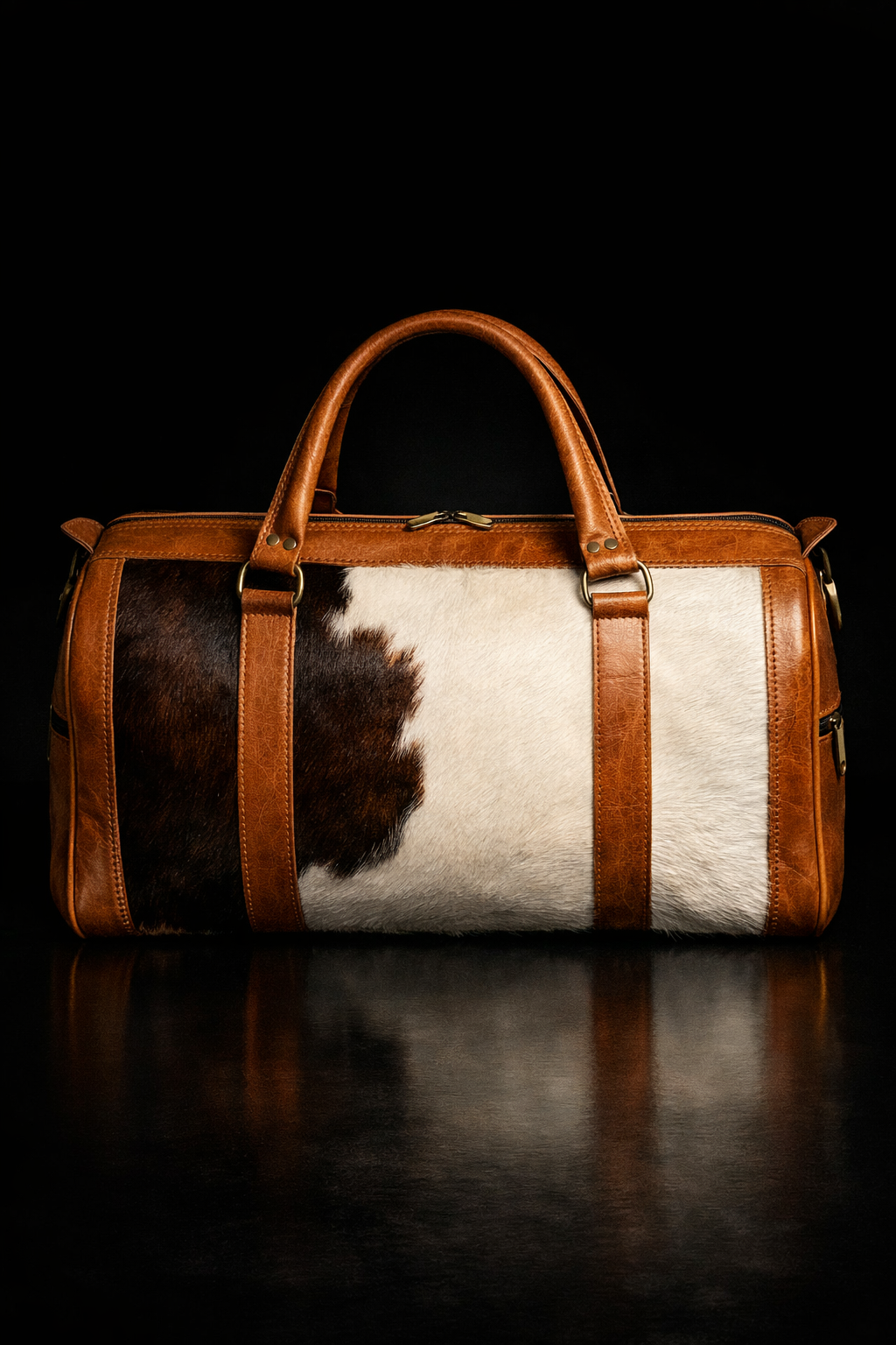 Built to command attention, designed to endure travel. Structured handles, reinforced leather straps, and a bold hide front panel make this duffle a symbol of raw luxury and controlled power.