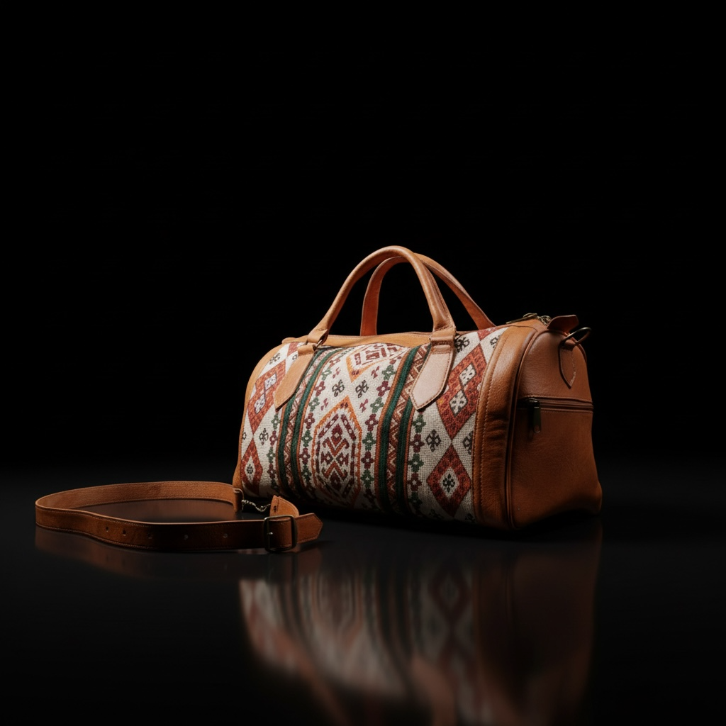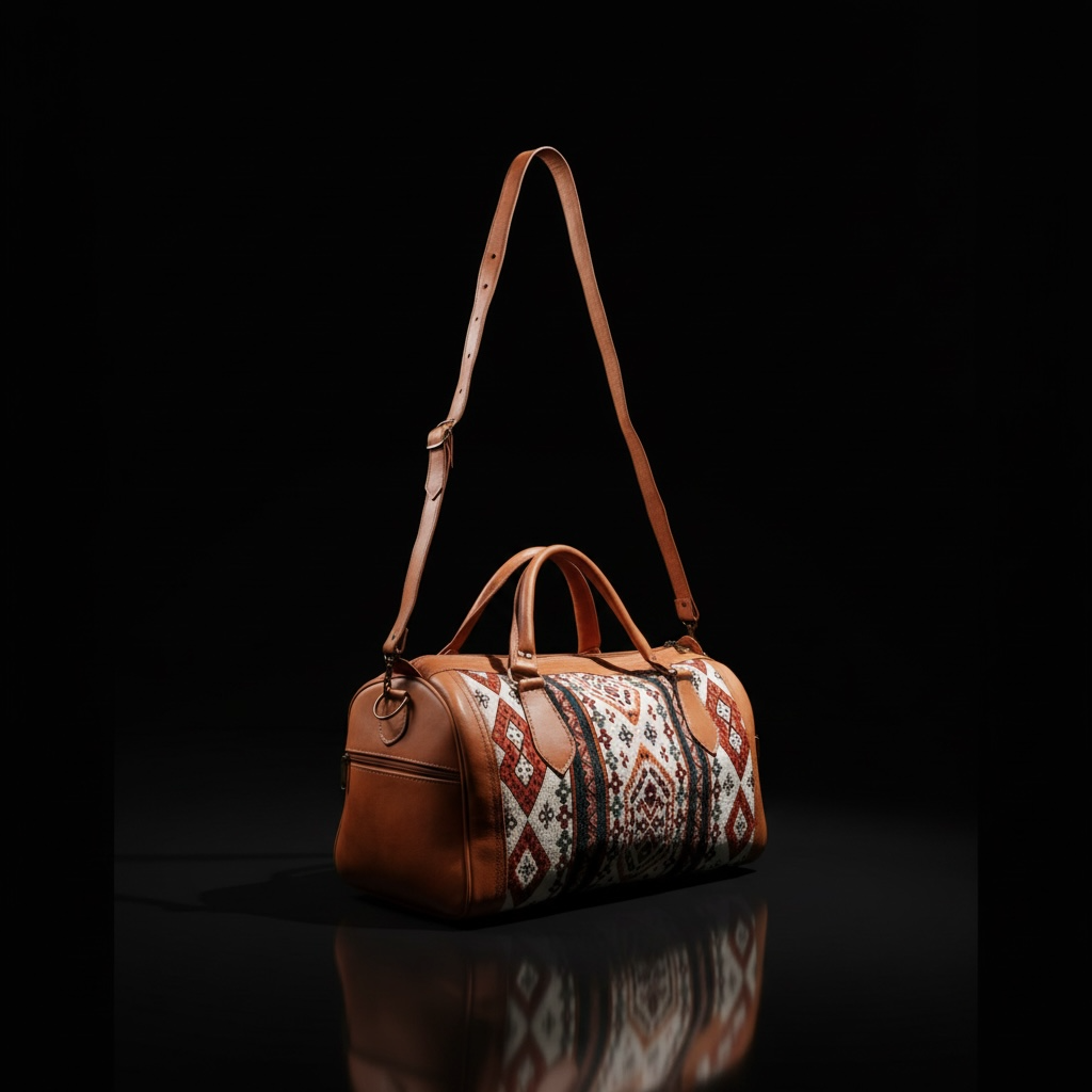 Its structured silhouette offers durability for travel, while the central patterned panel reflects heritage craftsmanship. The adjustable shoulder strap and reinforced handles provide versatility without compromising elegance.